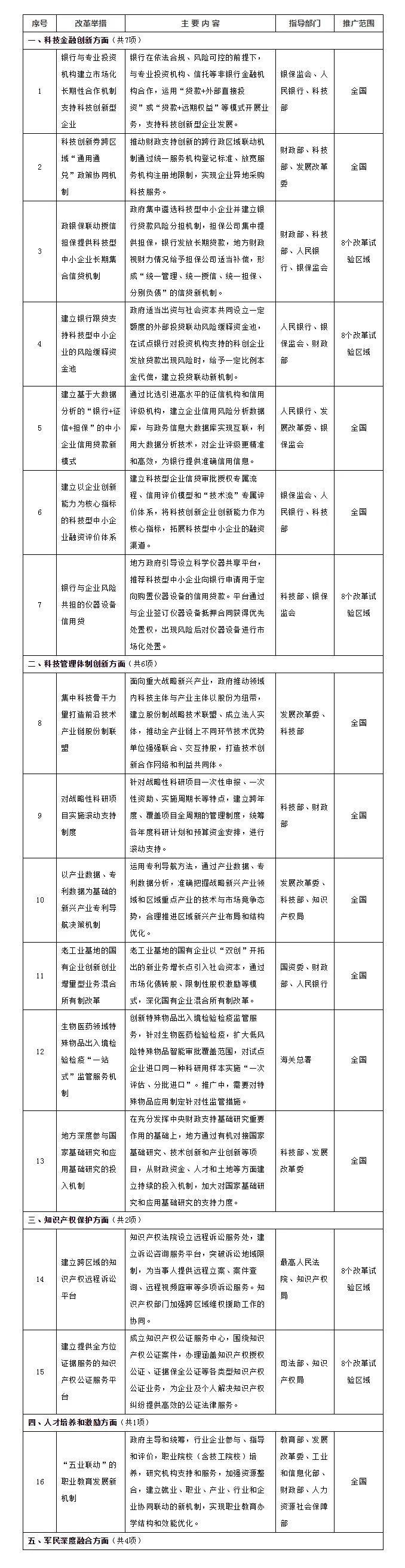 本次正式發(fā)布的20項改革舉措,是繼2017年首批13項、2018年第二批23項之后,由國辦發(fā)布的第3批向全國或在8個試驗區(qū)域范圍內(nèi)復(fù)制推廣、支持創(chuàng)新的改革舉措,涵蓋了科技金融創(chuàng)新、科技管理體制創(chuàng)新、知識產(chǎn)權(quán)保護(hù)、人才培養(yǎng)和激勵和軍民深度融合5個重點領(lǐng)域。根據(jù)我們觀察分析,經(jīng)過了前期的沉淀,以及進(jìn)一步的實踐探索,改革進(jìn)一步走向“深處”和“實處”,這批舉措緊密呼應(yīng)當(dāng)前中央的重要改革關(guān)切,充分體現(xiàn)了“實”和“新”,在一些改革的“老大難”問題上進(jìn)一步破題。