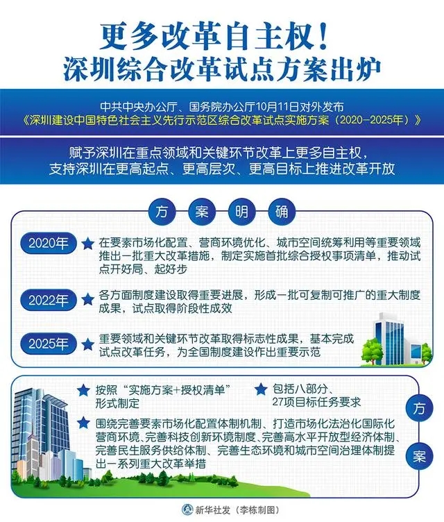 深圳又一次站上新起點。中共中央辦公廳、國務(wù)院辦公廳近日印發(fā)《深圳建設(shè)中國特色社會主義先行示范區(qū)綜合改革試點實施方案(2020-2025年)》,賦予深圳在重點領(lǐng)域和關(guān)鍵環(huán)節(jié)改革上更多自主權(quán),支持深圳在更高起點、更高層次、更高目標上推進改革開放。