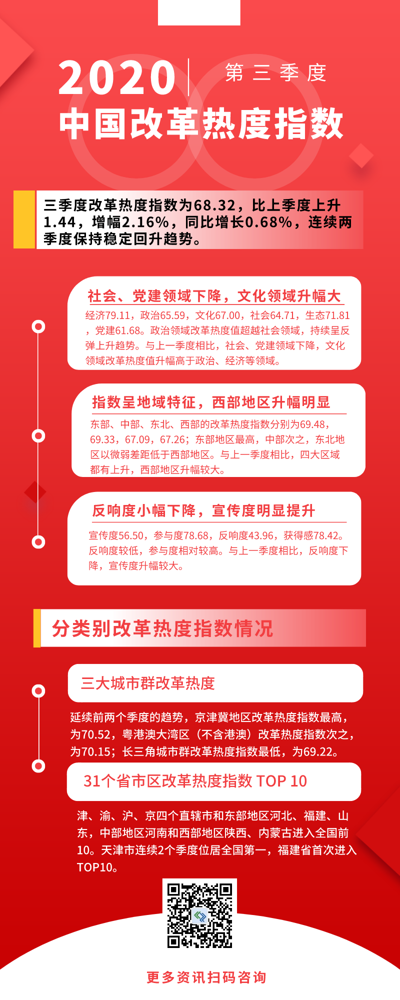 日前,中國經(jīng)濟(jì)體制改革研究會(huì)發(fā)布2020年第三季度中國改革熱度第三方評估報(bào)告。河南省改革熱度指數(shù)位居第六,濮陽、開封、鄭州、洛陽名列前茅。