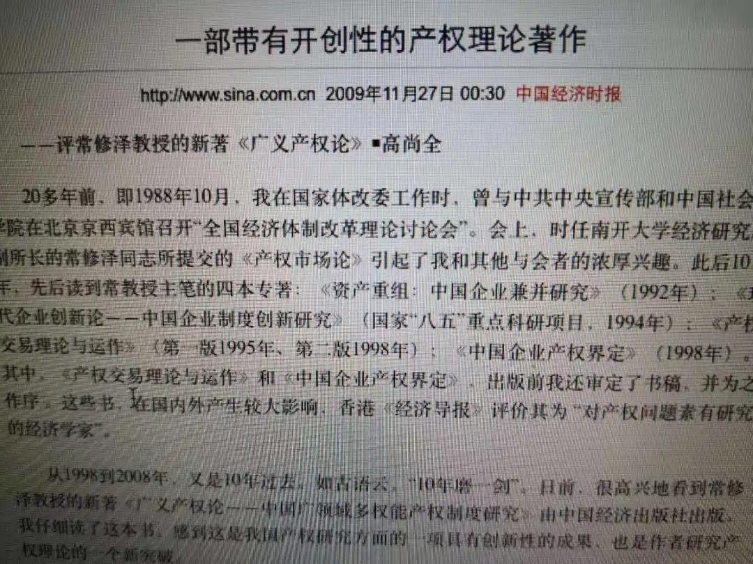 根據您的指點和林兆木先生等幫助,會后幾年,我從橫向“廣領域產權”(包括“天”——環(huán)境產權、“地”——資源產權、“人”——人本產權)以及縱向“多權能產權”和內核“四產權制度”三條線進行拓展、完善。六年后的2009年,我的《廣義產權論》出版。