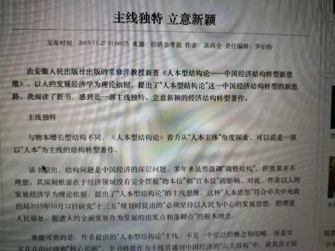 七年后,2008年,人本經濟學研究成果專著之一《人本體制論——中國人的發(fā)展及體制安排研究》出版。又過七年,2015年,人本經濟學研究成果專著之二《人本型結構論——中國經濟結構轉型新思維》也出版問世。在書中,按照我的人本經濟學理念,特別挖掘了馬克思在《政治經濟學批判導言》中關于“人”是主人、“品”是“仆役”的思想,試圖與傳統(tǒng)的“物本經濟學”和“權本經濟學”“ 劃清界限。我沒有忘記:出版后,您在《經濟參考報》撰文給予支持,題目雖然只有八個字:“主線獨特.立意新穎”,但觀點鮮明,呵護有加,頗感溫暖(見高尚全:《主線獨特.立意新穎》,《經濟參考報》2015年12月1日)。
