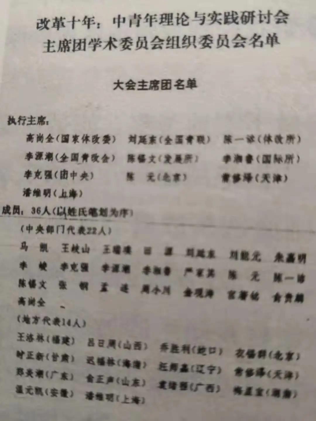 更使我難以忘懷的是,1989年春天的 “改革十年”大會(全稱為“改革十年:中青年理論與實踐研論會”),在北京京豐賓館舉行。近日,微信群流傳當年大會主席團名單,您位列十名執(zhí)行主席之首(我作為天津代表忝列其中)。在這個有全國400多位代表參加的大會上,各種思潮涌現:穩(wěn)健改革、偏于保守和偏于激進三種意見激烈爭辯。我參加了幾次執(zhí)行主席會議。在您和李克強、李源潮、劉延東等執(zhí)行主席的共同主持下,會議順利進行并圓滿結束。閉幕前,受到中央政治局、國務院領導和中央顧問委員會老同志的接見。在改革十年這一關鍵節(jié)點上的會議,受到各方關注和重視,是很不容易的。對這樣一個重要會議且直接共事數日,我又怎么能忘記?
