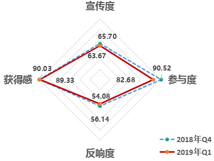 3.從維度來看,反響度呈現(xiàn)上升趨勢。宣傳度63.67,參與度82.68,反響度54.08,獲得感89.33。2019年第1季度,四大維度均比2018年第4季度有所下滑,其中參與度下降達(dá)7.84。從連續(xù)八個季度評估結(jié)果來看,反響度在穩(wěn)步提升,說明公眾在積極主動關(guān)注、討論各項(xiàng)改革。