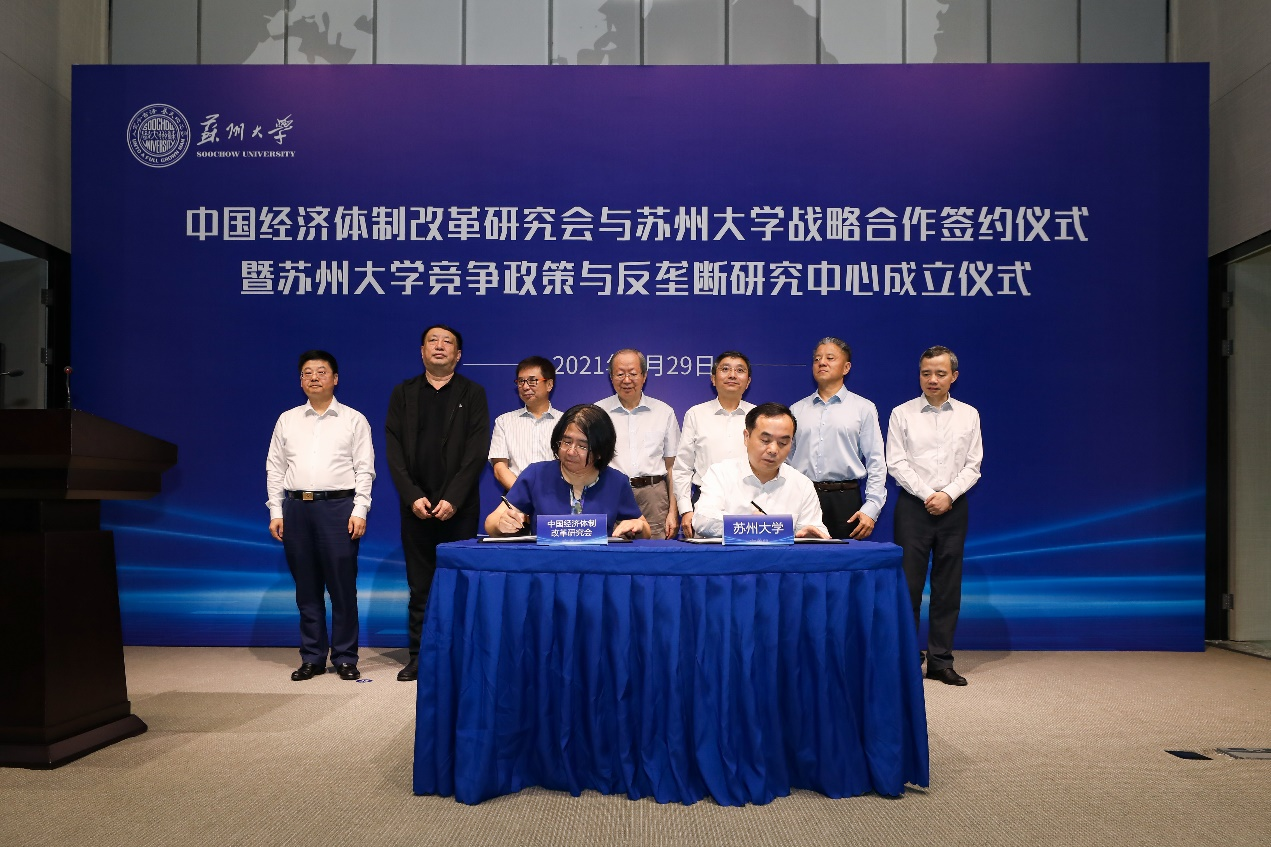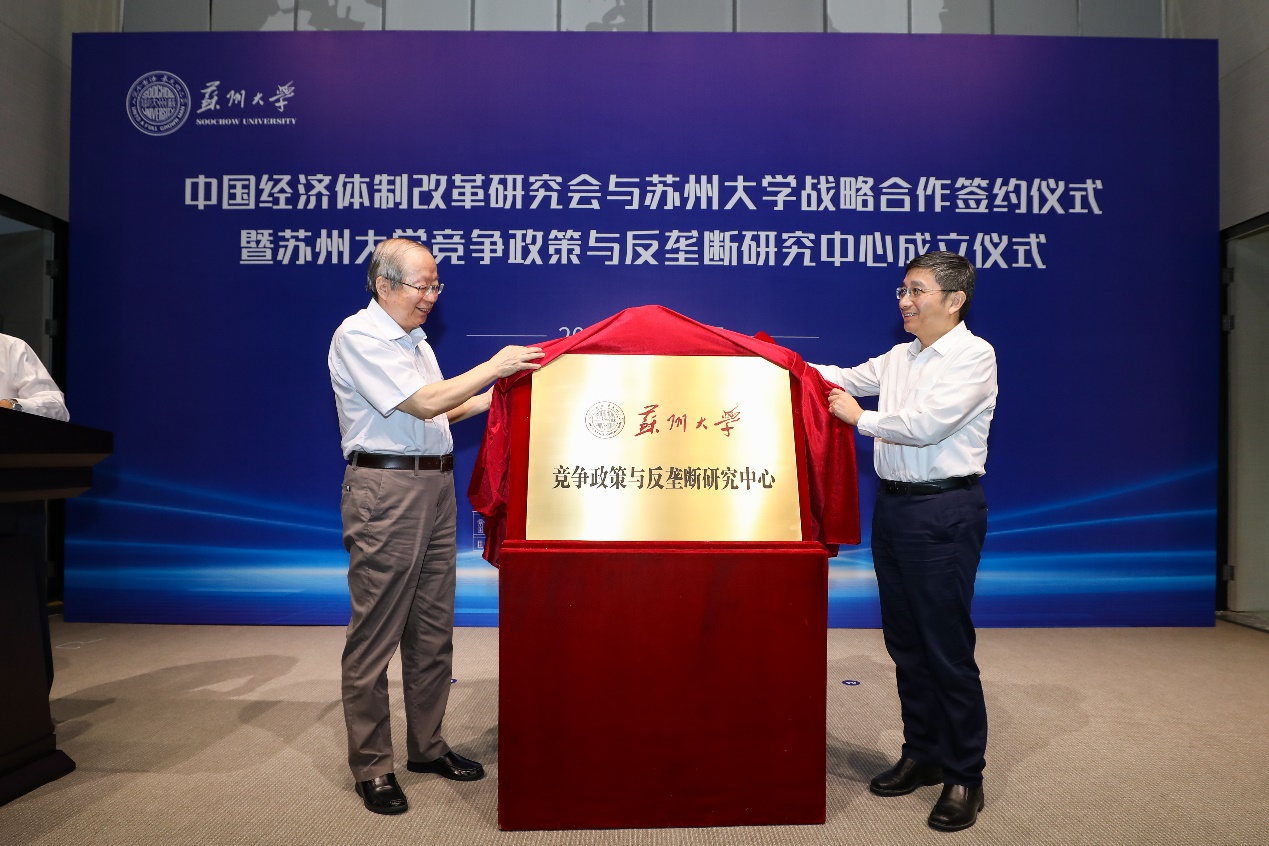 9月29日上午,彭森會長出席了中國經(jīng)濟體制改革研究會與蘇州大學(xué)共同舉辦的戰(zhàn)略合作協(xié)議簽署暨蘇州大學(xué)競爭政策與反壟斷研究中心揭牌儀式。蘇州大學(xué)黨委書記江涌代表蘇州大學(xué)致歡迎辭,彭森會長、江蘇省市場監(jiān)管局陳琪宏副局長、蘇州市副市長楊知評為會議致辭。