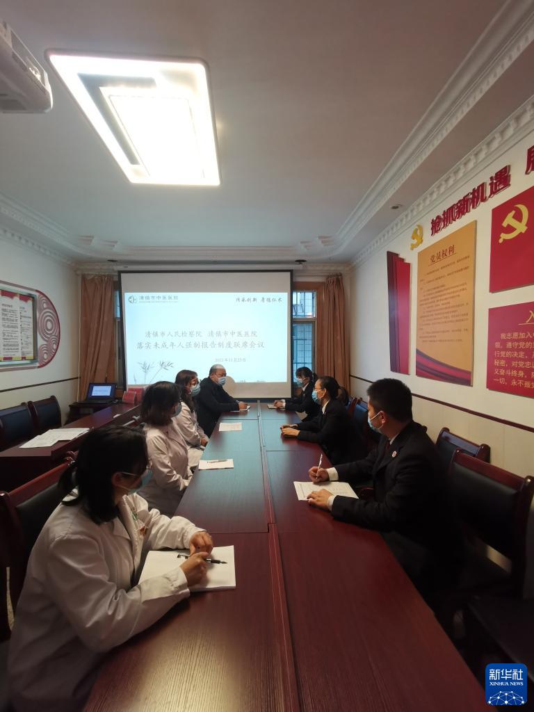 12月16日,貴州省清鎮(zhèn)市檢察機關與醫(yī)療機構召開聯(lián)席會議,研究推進醫(yī)療機構落實侵害未成年人案件強制報告制度。新華社發(fā)(杜遠敏 攝)