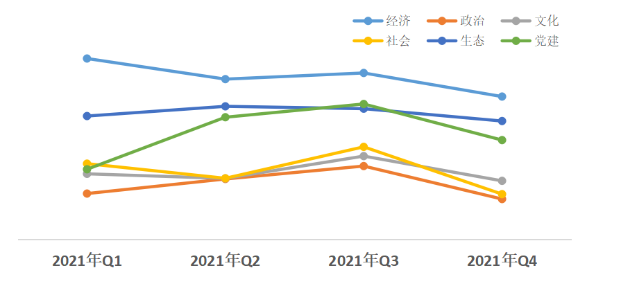 從近幾個季度的評估結(jié)果來看,除經(jīng)濟、生態(tài)領(lǐng)域,其他領(lǐng)域熱度值均在第三季度達(dá)到2021年度熱度指數(shù)峰值,但隨后呈下降趨勢。經(jīng)濟領(lǐng)域熱度值領(lǐng)先其他領(lǐng)域,政治領(lǐng)域改革熱度值偏低;社會、政治、黨建領(lǐng)域降幅較大。
