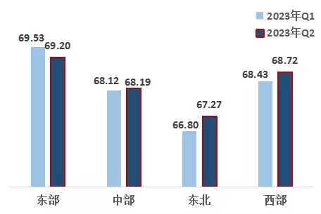 3、東部地區(qū)改革熱度指數(shù)下降,西部地區(qū)超越中部地區(qū)。東部、西部、中部、東北地區(qū)指數(shù)分別為69.20、68.72、68.19、67.27。東部地區(qū)領先,西部地區(qū)排名第二,且連續(xù)五個季度超越中部地區(qū),東北地區(qū)最后。與上一季度相比,中部、東北、西部地區(qū)改革熱度指數(shù)有所上升。