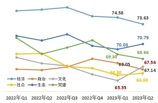 1、從改革熱度指數(shù)六大領域來看,政治、經(jīng)濟領域熱度值降幅略高于其他領域。第二季度,經(jīng)濟領域73.63,政治領域67.14,文化領域67.54,社會領域66.60,生態(tài)領域70.79,黨建領域68.66。與上一季度相比,文化、社會、生態(tài)領域上升,經(jīng)濟、政治、黨建領域下降;文化、生態(tài)領域增幅明顯,政治、經(jīng)濟領域降幅較大。