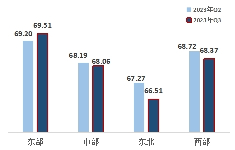 東部、西部、中部、東北地區(qū)指數分別為69.51、68.37、68.06、66.51。區(qū)域改革熱度指數呈適當的地域特征,東部地區(qū)領先,西部地區(qū)排名第二,且連續(xù)六個季度超越中部地區(qū),東北地區(qū)最后。與上一季度相比,東部地區(qū)改革熱度指數有所上升。