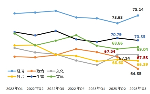 從改革熱度指數的六大領域來看,經濟領域75.14,政治領域64.85,文化領域67.53,社會領域66.39,生態(tài)領域70.33,黨建領域69.04。與上一季度相比,經濟、黨建領域上升。