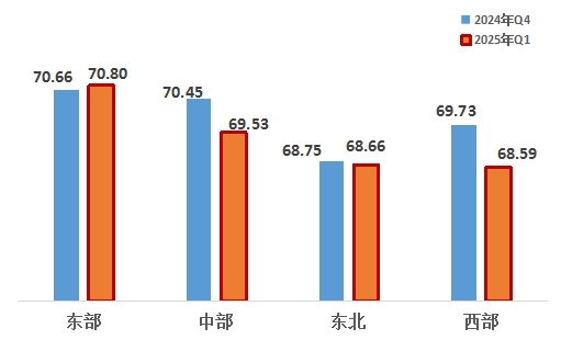 從四大區(qū)域來看,東部、中部、東北、西部地區(qū)分別為70.80、69.53、68.66、68.59,排名呈現(xiàn)明顯的地域特征,分別為東部第一,中部第二,東北第三,西部第四。連續(xù)兩個季度,東部地區(qū)名列四大區(qū)域之首且改革熱度指數(shù)提升。與上一季度相比,東北地區(qū)排名上升。