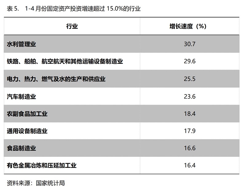 1-4月份,固定資產(chǎn)投資增速超過15%的主要行業(yè)共8個,即水利管理業(yè)增長30.7%,鐵路、船舶、航空航天和其他運輸設(shè)備制造業(yè)增長29.6%,電力、熱力、燃氣及水的生產(chǎn)和供應(yīng)業(yè)增長25.5%,汽車制造業(yè)增長23.6%,農(nóng)副食品加工業(yè)增長18.4%,通用設(shè)備制造業(yè)增長17.9%,食品制造業(yè)增長16.6%,有色金屬冶煉和壓延加工業(yè)增長16.4%。