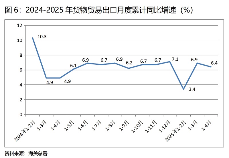 (六)貨物出口增速由升轉(zhuǎn)落。1-4月份,貨物出口同比增長6.4%,比1-3月份增長6.9%回落0.5個百分點,1-3月份比1-2月份回升3.5個百分點,增速呈現(xiàn)出由升轉(zhuǎn)落的態(tài)勢。貨物出口對主要貿(mào)易出口經(jīng)濟體增速有平有落也有升,1-4月份對歐盟出口同比增長4.9%,與1-3月份4.9%的增速持平;對美國出口下降2.5%,1-3月份增長5.6%,增速由增長轉(zhuǎn)為下降;對東盟出口增長11.5%,比1-3月份增長9.2%回升2.3個百分點;對拉丁美洲出口增長11.5%,比1-3月份增長10.7%回升0.8個百分點。在美國濫用關(guān)稅政策、對美國出口出現(xiàn)下降的情況下,我國出口仍能保持較快增長,特別是對一些主要經(jīng)濟體增長呈現(xiàn)加快的勢頭,充分說明我國出口不僅有較強的競爭力,也有較強的韌性。
