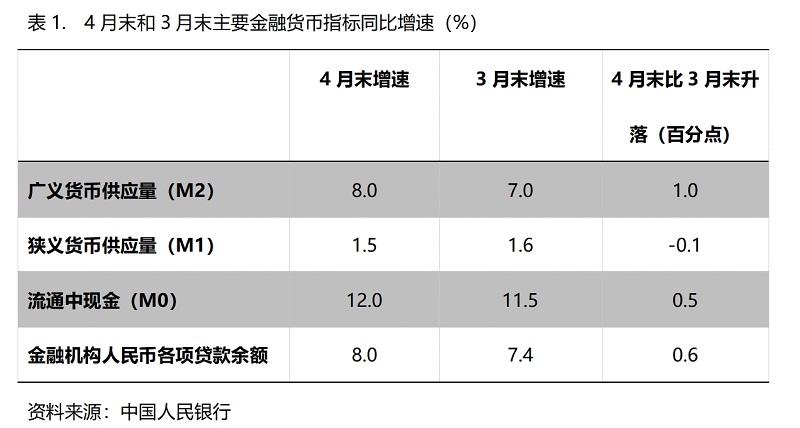 (一)M2增速由平轉(zhuǎn)升。4月末,廣義貨幣供應(yīng)量(M2)同比增長8.0%,比3月末增長7.0%回升1.0個百分點,實際上這是在今年前三個月末連續(xù)保持7.0%增速基礎(chǔ)上的回升;狹義貨幣供應(yīng)量(M1)增速比上月略有回落,4月末同比增長1.5%,比3月末增長1.6%回落0.1個百分點,而3月末增幅比2月末增幅回升1.5個百分點;流通中貨幣(M0)增速由升轉(zhuǎn)落,4月末同比增長12.0%,比3月末增長11.5%回升0.5個百分點,而3月末增速比2月末增速回升了1.8個百分點。貨幣政策正按照適度寬松的要求運行,這對推動經(jīng)濟回升將發(fā)揮積極作用,但各層次貨幣供應(yīng)量增速較大差異反映出的問題需引起關(guān)注。