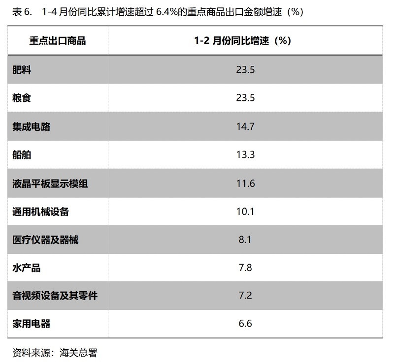 1-4月份,出口金額同比增速超過6.4%的重點商品共有10類,即肥料出口增長23.5%,糧食增長23.5%,集成電路增長14.7%,船舶增長13.3%,液晶平板顯示模組增長11.6%,通用機器設(shè)備增長10.1%,醫(yī)療儀器及器械增長8.1%,水產(chǎn)品增長7.8%,音視頻設(shè)備及其零件增長7.2%,家用電器增長6.6%。