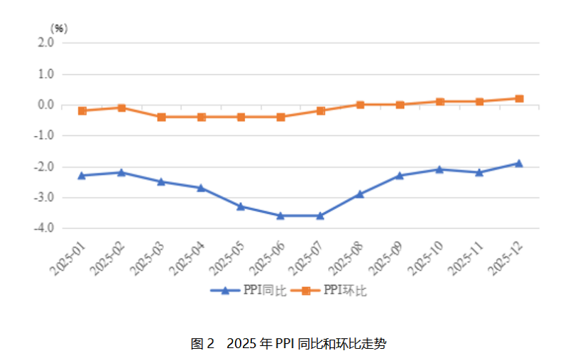 二是PPI呈“V”型走勢(shì),同比繼續(xù)下降。PPI同比下降2.6%,降幅比上年略擴(kuò)大0.4個(gè)百分點(diǎn)。生產(chǎn)資料和生活資料價(jià)格同步走低,且降幅較上年同期均有所擴(kuò)大。其中,生產(chǎn)資料價(jià)格同比下降 3%,降幅較上年擴(kuò)大 0.5 個(gè)百分點(diǎn)。從結(jié)構(gòu)上看,生產(chǎn)資料價(jià)格變動(dòng)呈現(xiàn) “上游降幅更深、下游相對(duì)較小” 的梯度特征。上游采掘業(yè)價(jià)格整體下降9.0%,成為生產(chǎn)資料中降幅最大的品類;中游的原材料工業(yè)價(jià)格同比下降3.4%;主要受終端需求不足、產(chǎn)品同質(zhì)化競(jìng)爭(zhēng)加劇等因素影響,下游的加工工業(yè)價(jià)格同比下降2.4%。生活資料中,食品價(jià)格下降1.6%,降幅比上年擴(kuò)大0.5個(gè)百分點(diǎn);衣著價(jià)格下降0.1%,降幅與上年持平;一般日用品價(jià)格上漲0.8%,漲幅比上年擴(kuò)大0.8個(gè)百分點(diǎn);耐用消費(fèi)品價(jià)格下降3.3%,降幅比上年擴(kuò)大1.1個(gè)百分點(diǎn)。主要能源行業(yè)價(jià)格大幅下降是拖累2025年P(guān)PI走勢(shì)的核心因素。其中,煤炭開(kāi)采和洗選業(yè)價(jià)格同比下降15.7%,降幅較上年大幅擴(kuò)大7.5個(gè)百分點(diǎn)。原因一是全球煤炭市場(chǎng)供過(guò)于求、國(guó)際煤炭?jī)r(jià)格持續(xù)走低,二是國(guó)內(nèi)煤炭行業(yè)產(chǎn)能優(yōu)化調(diào)整、清潔能源替代進(jìn)程加快,進(jìn)一步壓低了煤炭?jī)r(jià)格;石油和天然氣開(kāi)采業(yè)價(jià)格同比下降 9.9%,降幅較上年擴(kuò)大9.5個(gè)百分點(diǎn),主要受?chē)?guó)際地緣政治局勢(shì)緩和、全球原油產(chǎn)量增加導(dǎo)致的國(guó)際油價(jià)下行影響,國(guó)內(nèi)成品油價(jià)格聯(lián)動(dòng)調(diào)整,進(jìn)而傳導(dǎo)至上游開(kāi)采環(huán)節(jié)。上述兩大能源行業(yè)的價(jià)格深度下行,不僅直接拉低了采掘工業(yè)價(jià)格,還通過(guò)產(chǎn)業(yè)鏈傳導(dǎo)影響了原材料工業(yè)、加工工業(yè)乃至部分生活資料的成本與價(jià)格,成為PPI降幅擴(kuò)大的重要因素。?