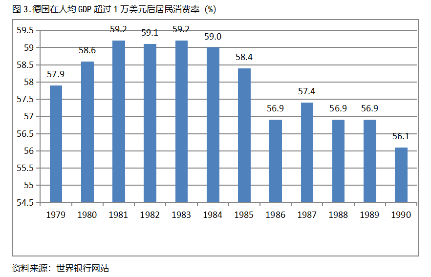 德國在人均GDP超過1萬美元后的12年期間,居民消費(fèi)率一直保持在56.0%以上,同時(shí)還呈現(xiàn)出先提高后回落總體穩(wěn)定的趨勢(shì)。德國在1979年人均GDP超過1萬美元,當(dāng)年居民消費(fèi)率為57.9%,1981年提高到59.2%,隨后又有所回落,1990年為56.1%,也就是說,德國在人均GDP超過1萬美元后的12年期間,居民消費(fèi)率由當(dāng)年的57.9%提高到1981年最高的59.2%,共提高了1.3個(gè)百分點(diǎn)。