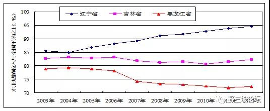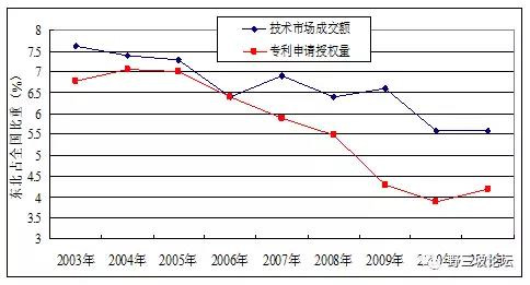 2011年,遼、吉、黑三省R&D經(jīng)費(fèi)支出分別占地區(qū)生產(chǎn)總值的1.52%、1.23%和1.02%,均低于全國1.84%的平均值,占全國比重由2003年的9.16%下降到2011年的7.1%。