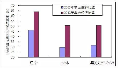 這里對民營經(jīng)濟(jì)發(fā)展和國企改革多說一兩句。2003年,東北國企所占的比重很高,有的省占到70%,到2012年遼、吉、黑三省非公經(jīng)濟(jì)比重分別達(dá)到64%、50.8%和51%。